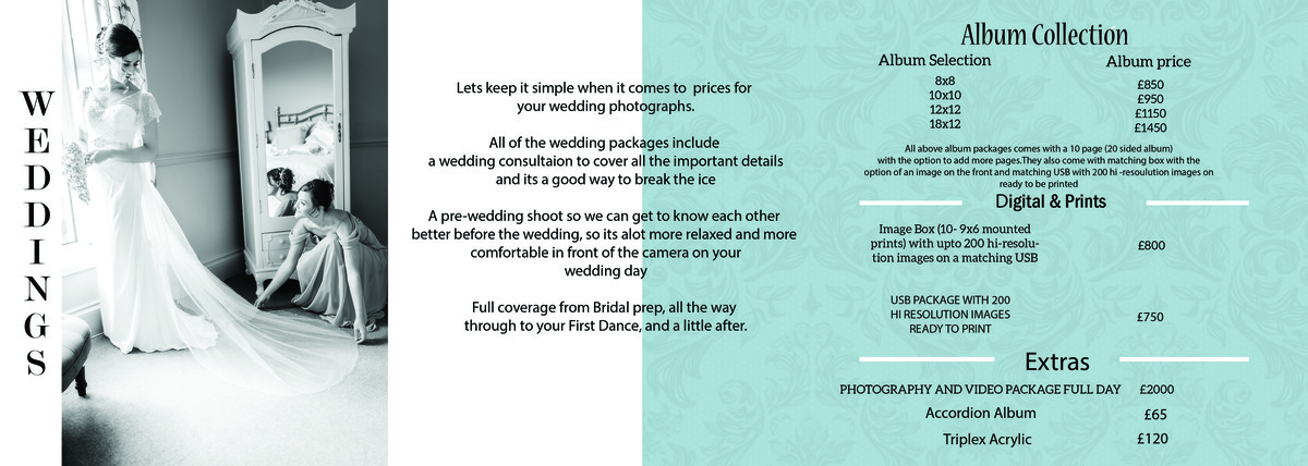 I make appointments to suite you and your partner, so if you'd like to pop and see me at my studio for a chat I can show you some albums, explain everything and answer any questions you might have before booking. To secure your date I require a £100 booking fee. The balance is then due 2 week before the wedding.